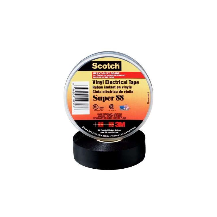 The Scotch Vinyl Electrical Tape Super 88 is an abrasion resistant tape that provides electrical and mechanical protection with the combination of an aggressive rubber resin adhesive and an elastic PVC backing. This tape is highly resistant to UV rays, moisture, alkalis, acids, corrosion, and varying weather conditions. It is designed to provide a protective jacket for low and high voltage bus applications. The tape is compatible with solid dielectric cable insulations, as well as epoxy and polyurethane resins. UL Listed, CSA Certified, and RoHS 2002/95/EC.