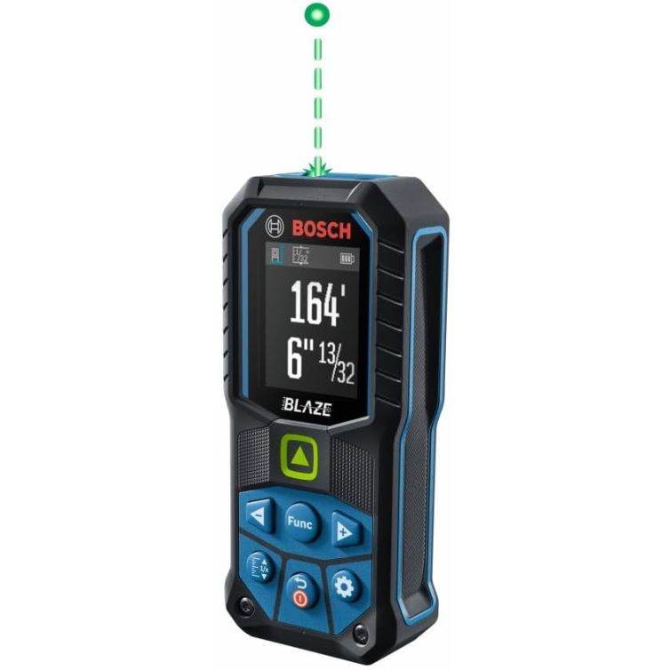 This 165' green-beam laser measure is a fully featured tool with an easy-to-read color display, great accuracy and reinforced housing for durability. The Bosch BLAZE GLM165-25G uses green-beam technology, which generates a point/dot up to 4X brighter than standard red beams. The laser has accuracy up to ±1/16", plus it includes a rounding button that rounds the measurement to the fraction that best suits the application and haptic feedback for loud jobsites. The digital laser measure also offers an IP65 rating, and it has an ergonomic design for better grip. It includes 11 different measuring functions, including real-time length, length, area, volume and indirect functions, and addition/subtraction capability.