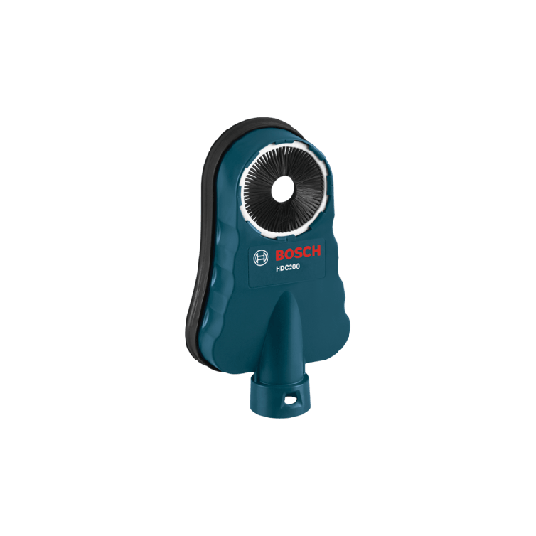The HDC200 is a flexible dust collection attachment for SDS-plus and SDS-max hammers for drilling into concrete. It is optimized for drilling diameters from 5/8 In. to 1-3/8 In. but can accommodate up to 2-1/2 In. if the brush ring is removed. The attachment features two unique air chambers: one allows the drilling bit to pass through when drilling into the work surface. The second air chamber is designed to maintain suction to the wall during the drilling application. The dust port is designed for Bosch 1-3/8 In. vacuum nozzle but can be used with either 1-1/4 In. or 2 In. vacuum nozzles when used with the appropriate adapter. The system is universal and is designed to connect to a vacuum so that it can be used with any size hammer and can accommodate the full range of drill bit diameters and drilling depth.