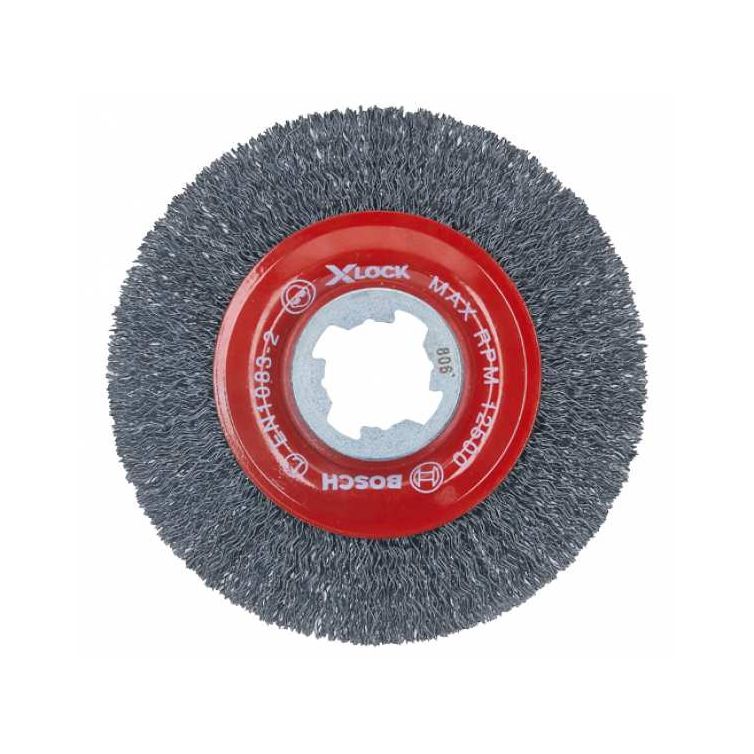 Bosch's X-LOCK Wire Wheels feature the X-LOCK mount and offer a wheel change that's up to five times faster than conventional interfaces. There’s an audible snap when mounting an X-LOCK Wheel on an X-LOCK grinder. The wheel mounts properly without the need for a spanner wrench or flange nuts. The wheel is released from the grinder with the pull of a lever. This high-quality crimped tempered steel features maximum wire density for long life, to de-burr gears, remove oxides, scale, flash, and for edge blending. Bosch cable-knotted, stringer bead and crimped wire wheels are ideal for deburring metal, bead weld prep, cleaning welds, edge blending and more. The precision-balanced wheel and robust construction allows for professional applications.