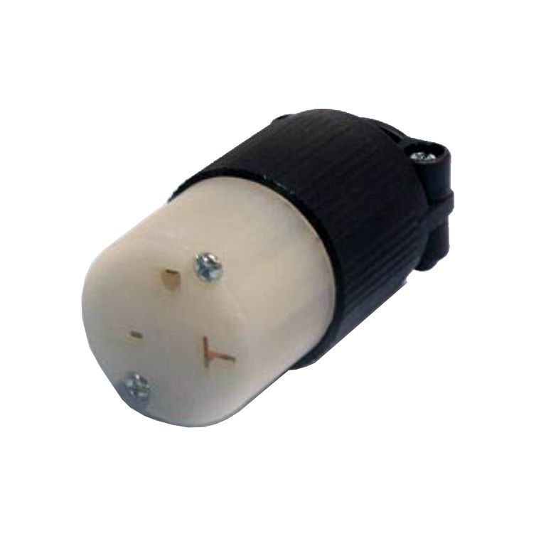 This straight-blade power connector is rated to 250 volts and 20 amps. It features a nylon housing for chemical resistance and durablility, external cord grips and colour-coded terminals.