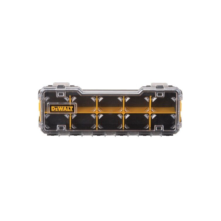 This DEWALT 10-compartment organizer with removable dividers is optimal for hand tools and small parts, featuring a durable, polycarbonate lid and side latches that enable stacking to other PRO organizers.