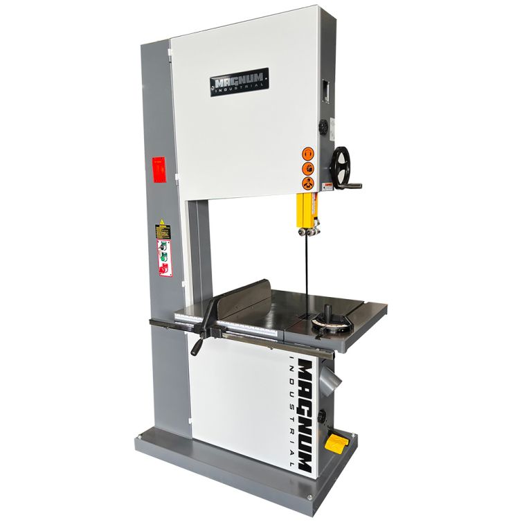 The Magnum Industrial MI-91800Â has a large capacity, with a heavy cast table and support trunnions. The 24" heavy-duty deluxe bandsaw will accept blades as wide as 1.5" down to 1/4". It is simple to set up double-wide bearing guides. This bandsaw, with a high duty rating loaded with extra safety features, is a good choice for advanced schools or small manufacturing and custom millwork shops for a variety of projects.