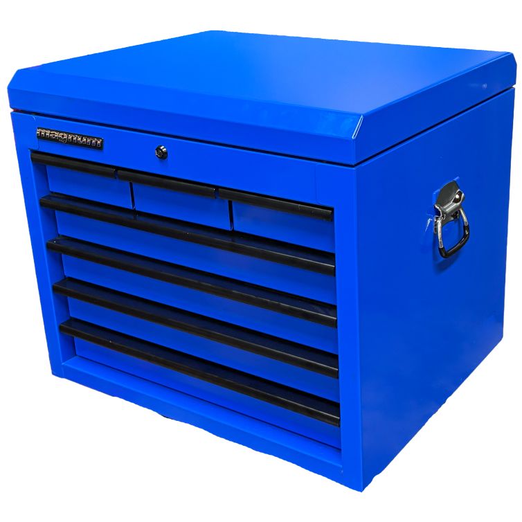 The Magnum TBT2707BLU is a 26" top chest featuring seven drawers, constructed from durable 1.0 - 1.2mm cold-rolled steel. Its electro-powder coated finish provides superior resistance to abrasion and corrosion, ensuring long-lasting performance. The drawers are equipped with 19" full-extension ball-bearing slides that have a soft-close function, each capable of holding up to 100 lbs. Dual gas struts assist in effortlessly opening and securely holding the lid, while hardened steel tubular side handles make maneuvering the chest easy. For added security, an internal lock system secures all drawers. The chest also includes non-slip liners in every drawer to protect and organize your tools.