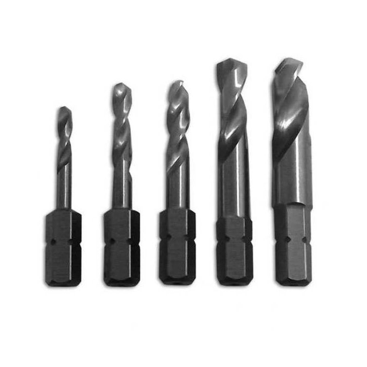 - This 5 piece set includes common size drill bits: 3/32" (2.4mm), 1/8" (3.2mm), 3/16" (4.8mm), 1/4, (6.4mm), 5/16" (7.9mm)