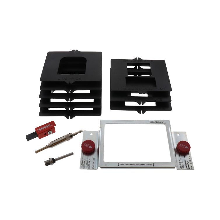 - Contains templates needed to rout hinge, strike plate, and latch plate mortises