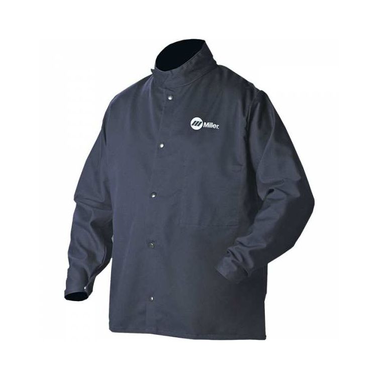 Designed to endure everyday industrial use, Miller's classic cloth welding jacket features nine-ounce flame-resistant cotton, pre-shrunk to eliminate sleeve shrinkage. Other features include finished hems and reinforced stitching for enhanced durability.
