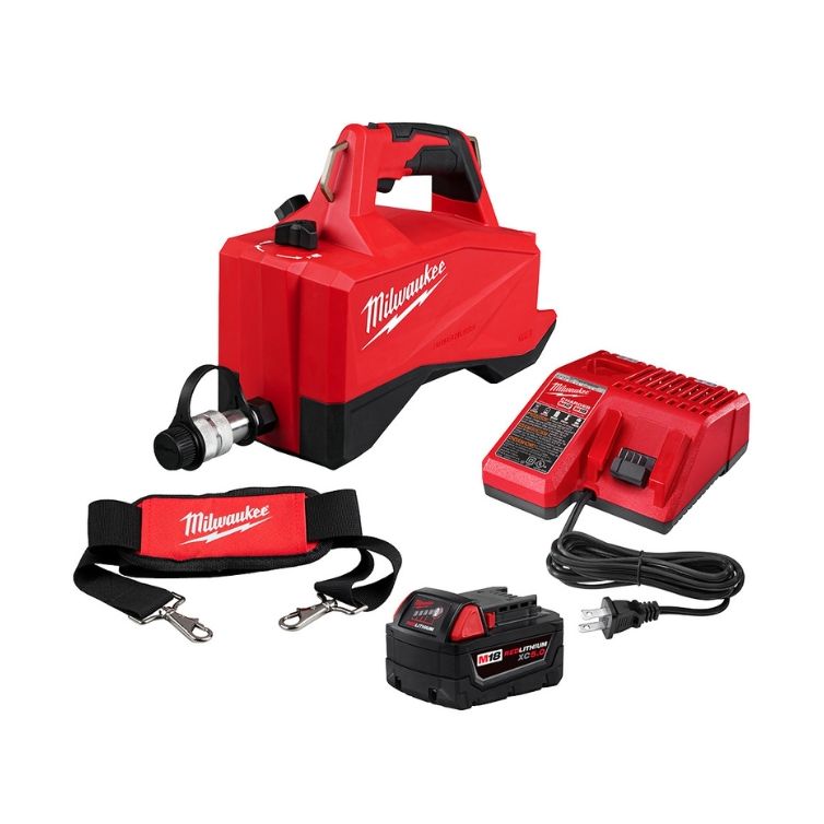 M18™ Brushless Single Acting 60in3 10,000psi Hydraulic Pump eliminates manual pumping, delivering up to 2.5X faster application speeds. By eliminating the need to manually pump, this solution vastly reduces fatigue, with up to 95% less muscle effort vs. hand pumps, delivering increased productivity and faster applications. The single-acting pump features 60in3 of usable oil to fully extend a wide variety of small tools and cylinders to full stroke. The single-acting hydraulic pump is designed to be fully compatible with all existing 10,000psi single-acting rated hydraulic hoses and cylinders. A manual valve allows precise control over return flow, while a bladder window allows you to quickly gauge fluid levels. At 12.6lbs, this compact pump is highly portable and allows easy transport to your application. A trigger lock-out helps prevent unwanted tool activation in transport, set up, and tear down. The kit includes (1) M18™ XC 5.0 REDLITHIUM™ Battery, an M18™ and M12™ Multi-Voltage Charger, a Shoulder Strap, and a 3/8” NPTF Female Quick Connect Cone Poppet Coupler (installed on the tool).