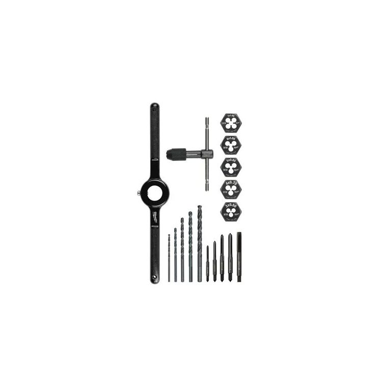 The MILWAUKEE® 17-Piece Metric Tap and Die Set includes precision machined threading accessories and threading handles for the most common applications. The Taps and Dies feature long-lasting laser-etched sizing for the clearest markings and include a protective Black Oxide coating for corrosion resistance. The Plug Taps square shank is compatible with all standard tap handles or tap wrenches and is designed for through-hole threading. The Hex Dies 1” hex shape is compatible with the MILWAUKEE® Hex-LOK™ 2-in-1 Handle (sold separately), as well as all standard 1” Hex Die stocks. The set includes accompanying drill bits for pilot drilling and is designed for use with drill drivers. The Taps and Dies are designed for cutting threads in the most common metal applications including brass, aluminum, mild steel, and more. For best results, use with cutting fluid.