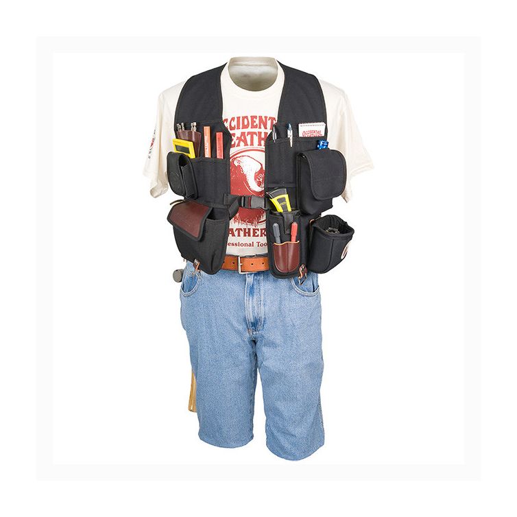 The Builders’ Vest is a compact vest tool carrying system, loaded with tool holders and pockets. It can be worn as an independent vest tool carry system or worn with a tool belt. The vest features ideal organization, an ergonomic design, even load distribution, and total freedom of movement. It comes with one 2003 Pocket Shield for a sharp knife or chisel.
