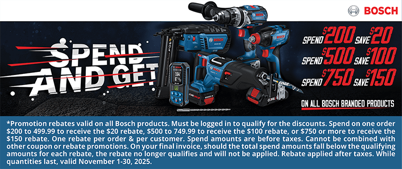 *Promotion rebates valid on all Bosch products. Must be logged in to qualify for the discounts. Spend on one order $200 to 499.99 to receive the $20 rebate, $500 to 749.99 to receive the $100 rebate, or $750 or more to receive the $150 rebate. One rebate per order & per customer. Spend amounts are before taxes. Cannot be combined with other coupon or rebate promotions. On your final invoice, should the total spend amounts fall below the qualifying amounts for each rebate, the rebate no longer qualifies and will not be applied. Rebate applied after taxes. While quantities last, valid November 1-30, 2025.
