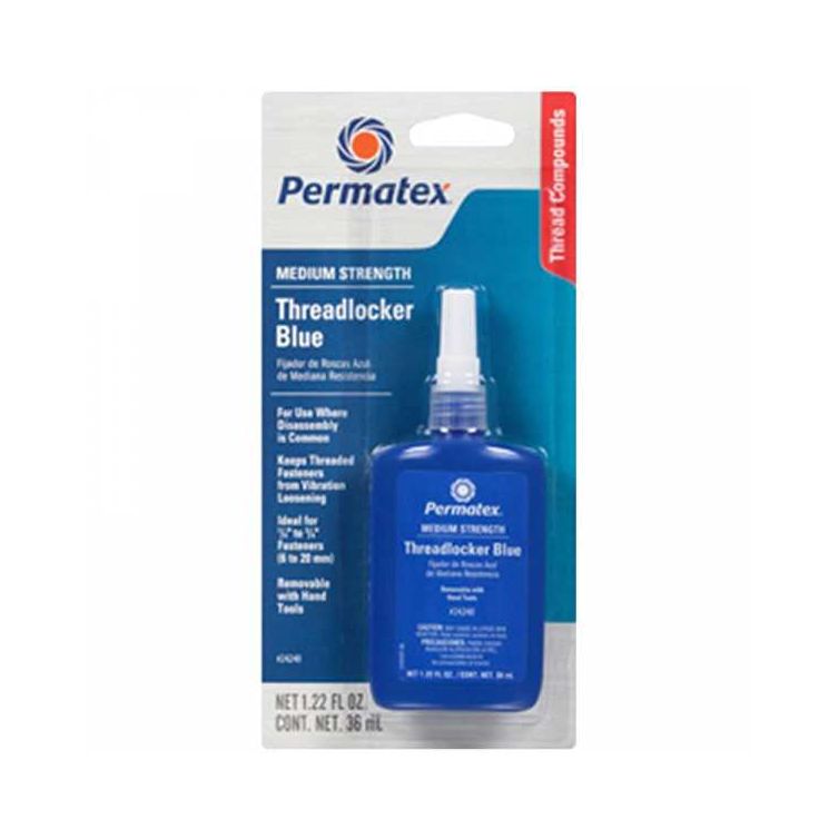 PERMATEX Medium Strength Threadlocker BLUE 24242 is a medium strength anaerobic threadlocking material, which cures between engaged threads to form a unitized assembly that resists virtually all leakage, shock and vibration. The product is a single component, anaerobic liquid that cures when confined in the absence of air between close fitting metal surfaces. Ideal for all 1/4 inch to 3/4 inch diameter nut and bolt assemblies.
