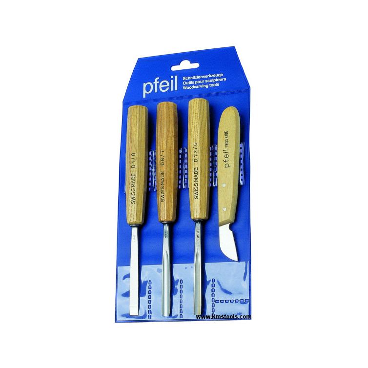 Set includes one Pfeil chip carving knife and three carving chisels: D 1/8, D 8/7 and D 12/6.