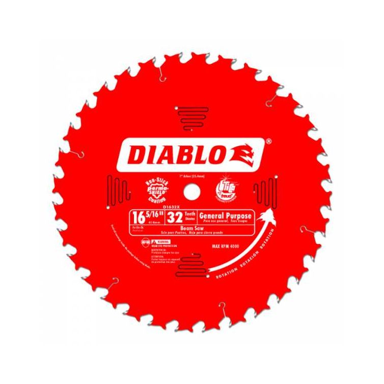 Diablo's D1632X is ideal for cutting oak, pine, plywood, pressure treated lumber, wood composites and beams. Diablo's 16-5/16 inch x 32 tooth ATB general purpose saw blade for large capacity beam saws. Ideal for timber framing such as laminated veneer lumber, glued timber (glulams) and p+aralams.