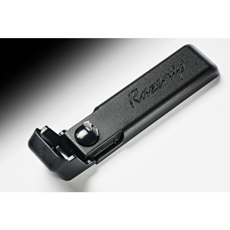 This ingenious tool removes carbon buildup from most sharp Razertip® tips quickly and easily. Prolongs tip life (compared to using abrasives). One hand operation; works without turning off power. New design includes a flip-away blade cover for safety.