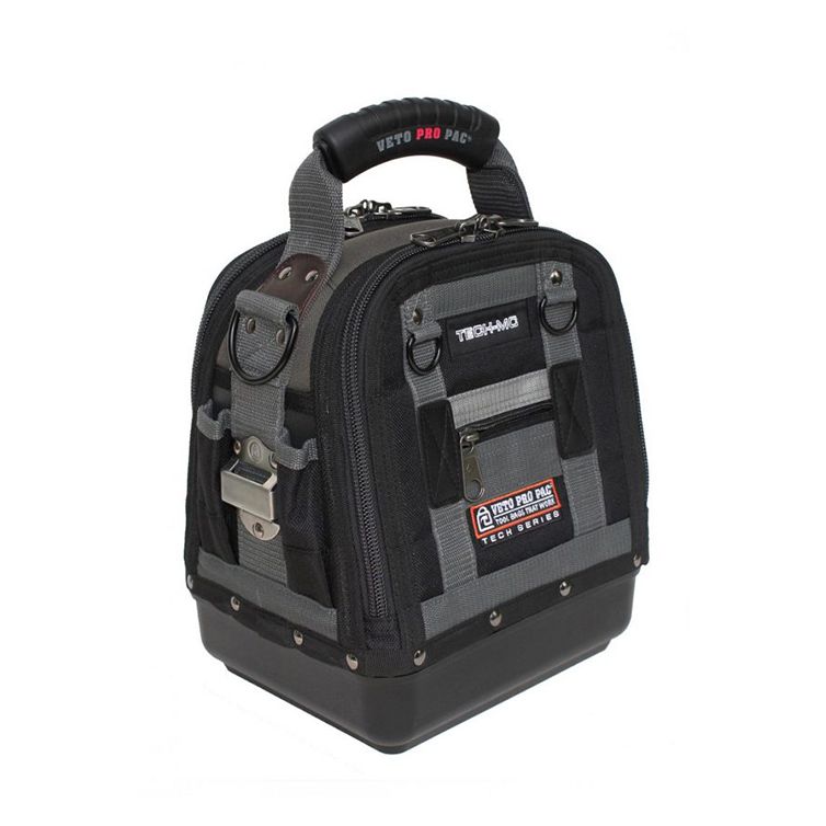 With 38 pockets inside and out and a center panel design, the Tech MC has two storage bays with ample room for hand tools, meters, and a compact cordless drill, as well as smaller tool and accessories. It also includes D-rings, bit extension and memory stick pockets, and a stainless steel tape clip as well as a quick access outside pocket for drill bit extensions and small items. An over-molded ergonomic grip and a 3" wide padded shoulder strap provide comfort for a potential load of 50 tools.