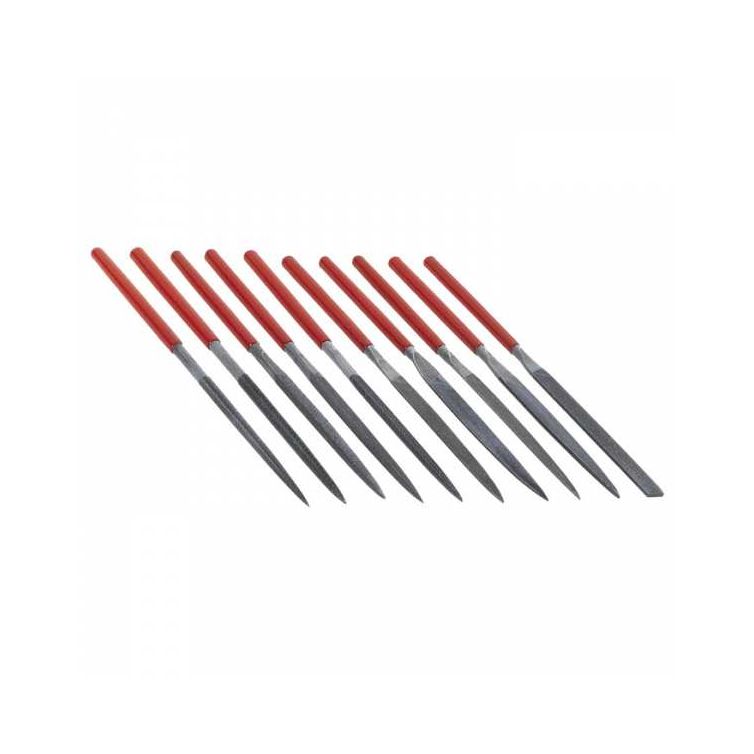 This needle nose file set with vinyl grip handles has ten profile shapes including round, half-round, flat, triangular, knife-edge, square and oval. All tips except the square nose flat file taper to a needle nose point for reaching into tight spots. Each file in the set measures 7" long.